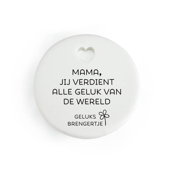 Lieve mama ik hou van jouGeluksbrengertjeOok als sleutelhanger of ketting te gebruikenKleur: wit met zwarte opdrukMateriaal: keramiekAfmeting: 4.3x0.5 cm (⦰xh)Gewicht: 18 gramArt.nr. 68571