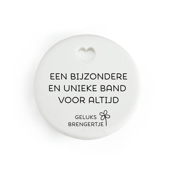 Moeder en DochterGeluksbrengertjeOok als sleutelhanger of ketting te gebruikenKleur: wit met zwarte opdrukMateriaal: keramiekAfmeting: 4.3x0.5 cm (⦰xh)Gewicht: 18 gramArt.nr. 68573