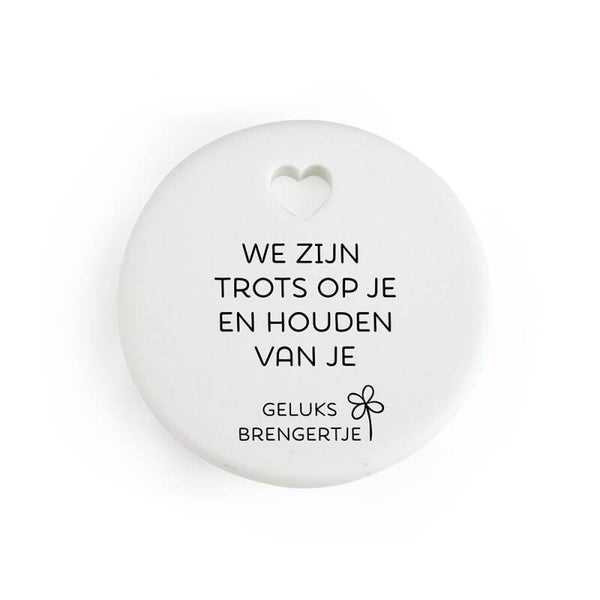 Lieve dochterGeluksbrengertjeOok als sleutelhanger of ketting te gebruikenKleur: wit met zwarte opdrukMateriaal: keramiekAfmeting: 4.3x0.5 cm (⦰xh)Gewicht: 18 gramArt.nr. 68577