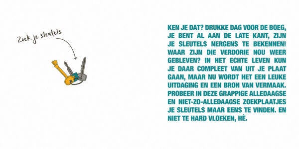 Ben jij ook altijd je sleutels kwijt? In het echte leven kun je daar compleet van uit je plaat gaan, maar nu wordt het een leuke uitdaging en bron van vermaak. Dit boek staat vol alledaagse en niet-zo-alledaagse zoekplaatjes. Probeer je sleutels maar eens te vinden! Leuk om cadeau toe doen.