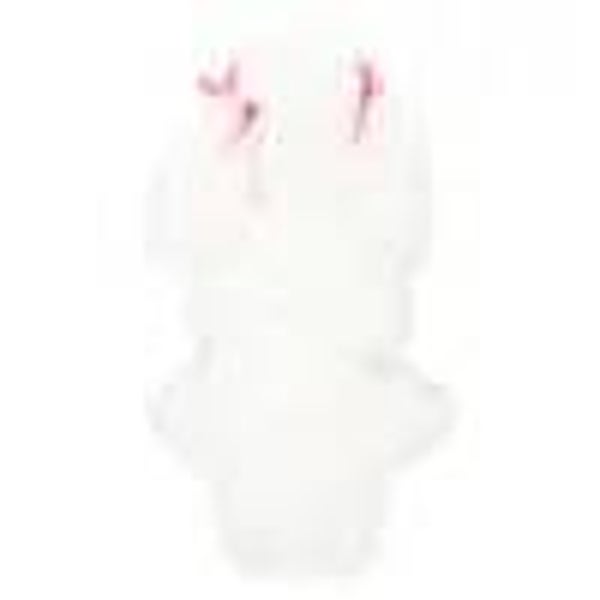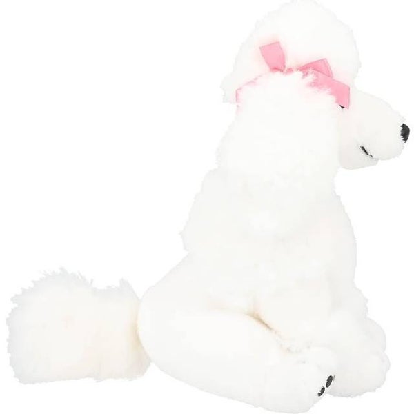 Super schattig en knuffelig zacht: de witte pluche poedel Chanel heeft zwarte knoopogen en een roze strikje op elk oor.