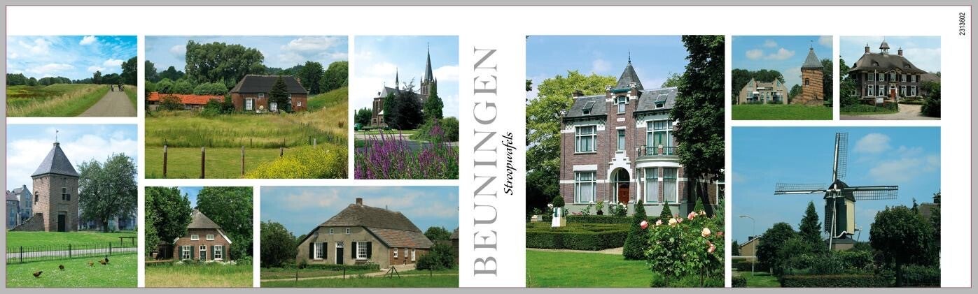 Nostalgisch blik met afbeeldingen uit de gemeente Beuningen, gevuld met oud-Hollandse stroopwafels Kleur: multi color Materiaal: blik Afmeting: 10.5x10.5cm (Øxh) Inhoud: 8 stroopwafels (250 gram) Art.nr. 1360
