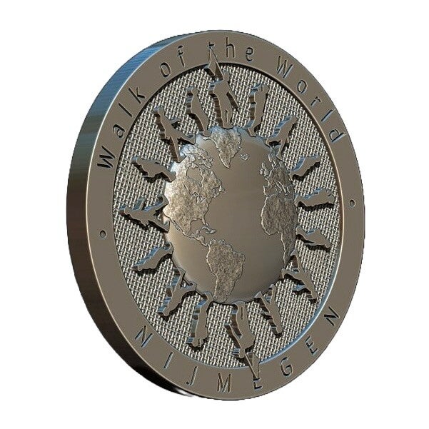 De achterzijde bevat een wereldbol met rondom diverse wandelaars.