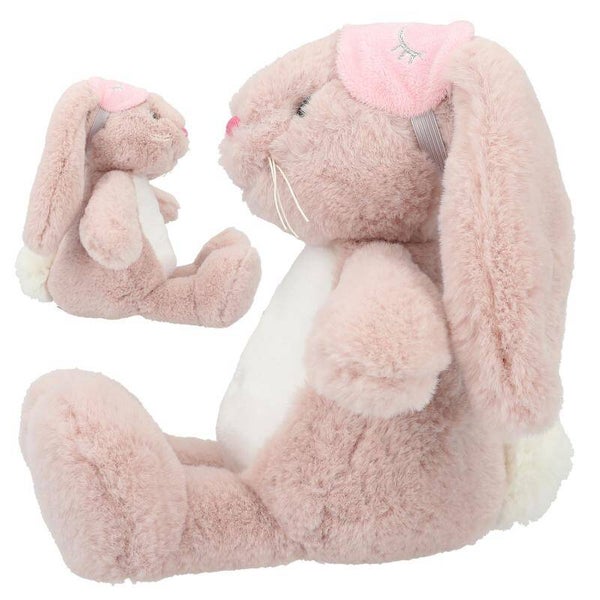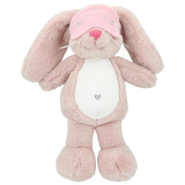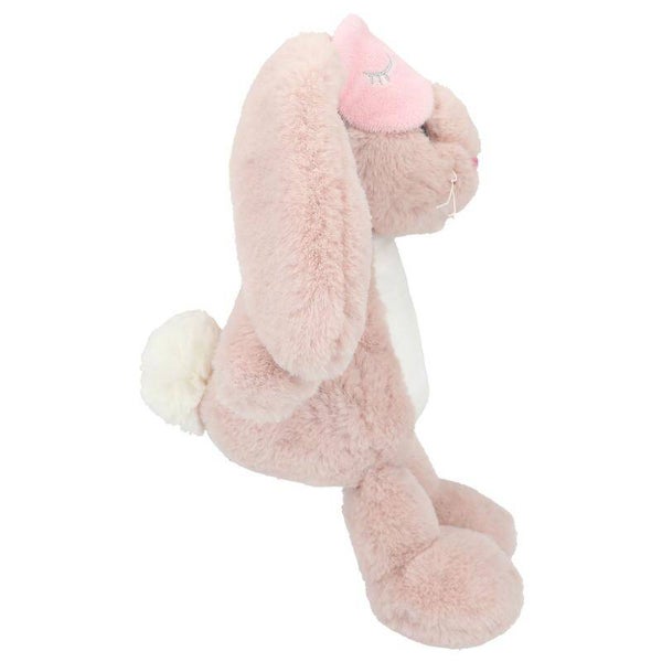 knuffelkonijn Nelly van prinses Mimi. Met superzacht oudroze vachtje, schattige flaporen, geborduurde slaapogen op een roze slaapmasker.