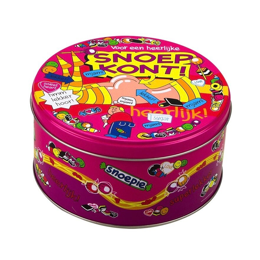 Kleurrijke snoeptrommel met met leuke teksten en afbeeldingen.