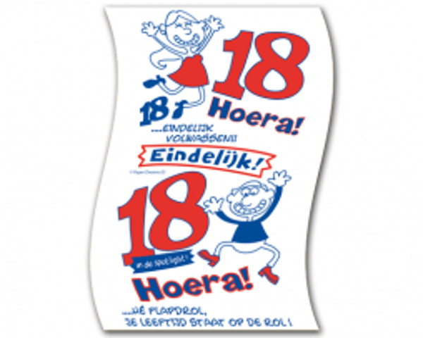 “18 hoera! …eindelijk volwassen!! Eindelijk! 18 in de spotlight! Hoera! …Hé flapdrol, je leeftijd staat op de rol!”.Afmeting: 10x9 cm (hx∅)Art.nr. 7020302