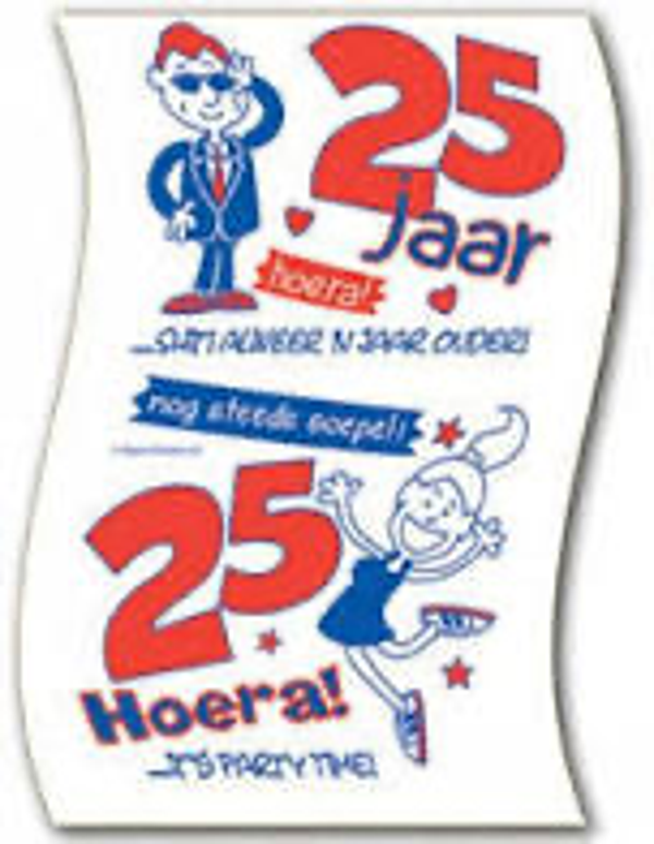"Nog steeds soepel! 25 Hoera! …Its partytime!25 jaar hoera! …Shit! Alweer een jaar ouder!”.Afmeting: 10x9 cm (hx∅)Art.nr. 7020305