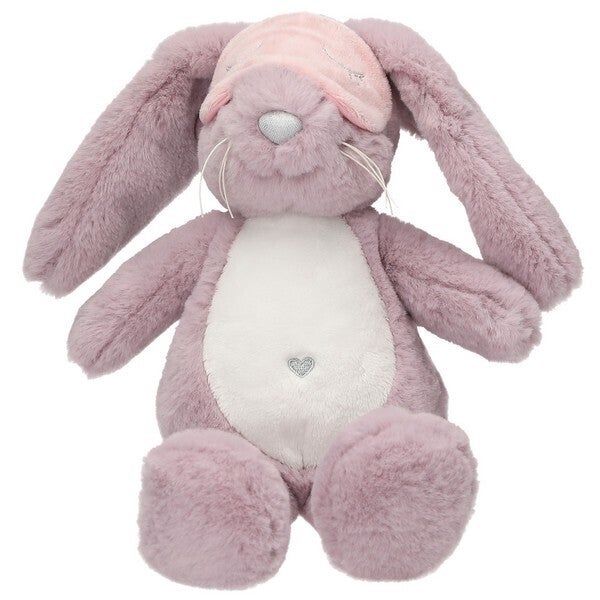 Zachte knuffeldromen! Het superzachte knuffel konijn in lila heeft een zachte buik, een leuk glitterneusje, lange flaporen, een geborduurde hartvormige navel en een roze slaapmasker die je op en af kunt zetten.