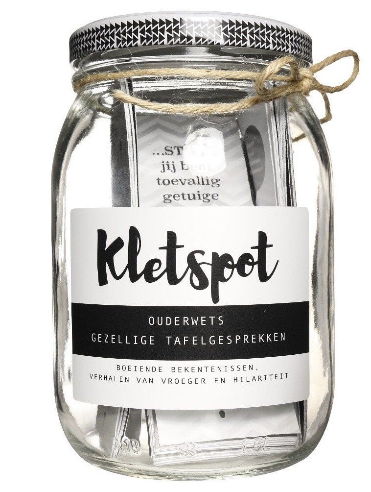 De Kletspot is een decoratieve pot vol kaarten met grappige vragen, stellingen en hilarische dilemma's. Dit gezelschapsspel brengt de ouderwetse gezellige tafelgesprekken weer terug in de huiskamer.