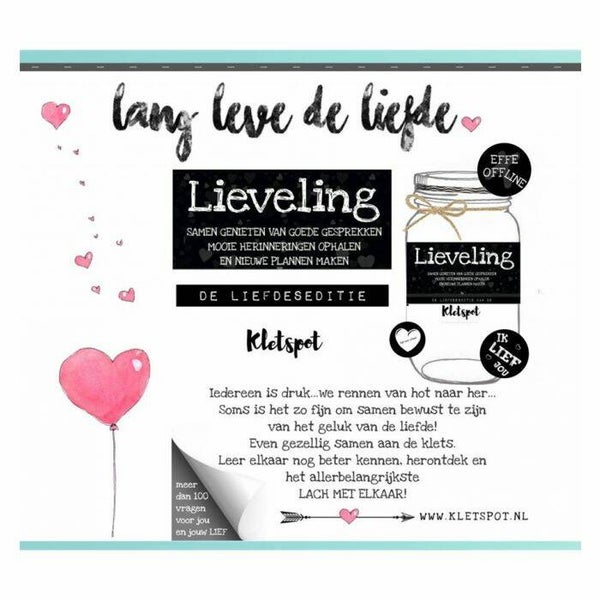 Lieveling is de kletspot voor de liefdeeven wat quality time voor elkaar … met elkaar …Kleur: zwart/witMateriaal: glas/metaal kartonAfmeting: 18x13 cm (hxโฆฐ)Inhoud: 100 kaartjes