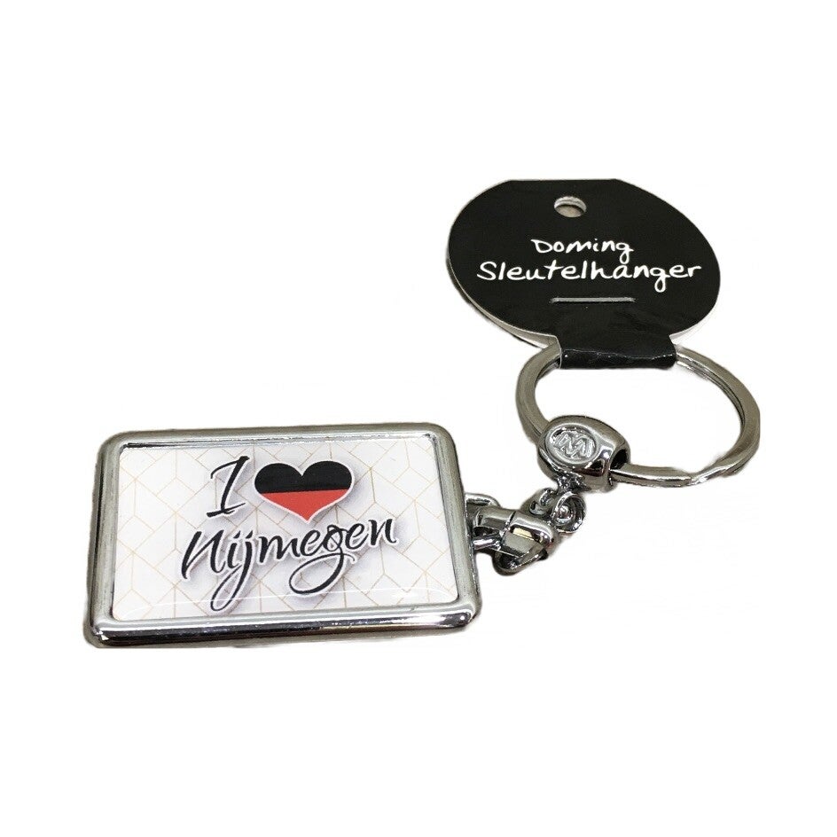 Sleutelhanger met twee afbeeldingen.Kleur: wit rood zwartMateriaal: metaal/kunstofAfmeting: 10 cm (l) afbeelding 4x3 cm (lxb)Art.nr. 3305111